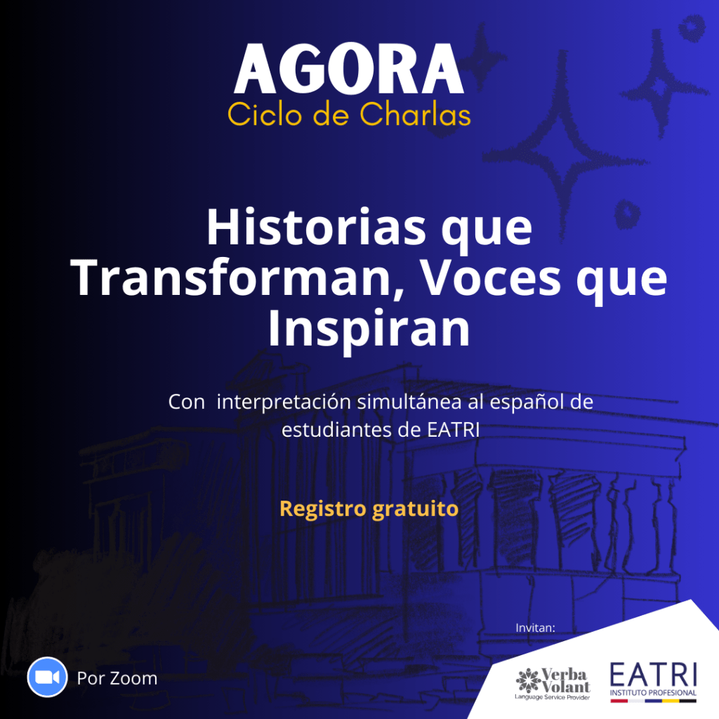 Ágora es un ciclo de charlas online que reúne a destacados profesionales de áreas como la música, la educación, el marketing, la traducción e interpretación, los negocios, y más. Este espacio busca conectar, inspirar y fomentar el intercambio de ideas, al mismo tiempo que brinda a los estudiantes de último año del IP EATRI de Chile una valiosa oportunidad de ofrecer interpretación simultánea en vivo.